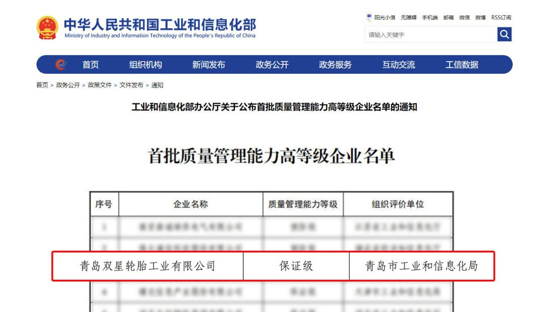 行業(yè)唯一!雙星輪胎入選工信部質(zhì)量管理能力高等級(jí)企業(yè)名單